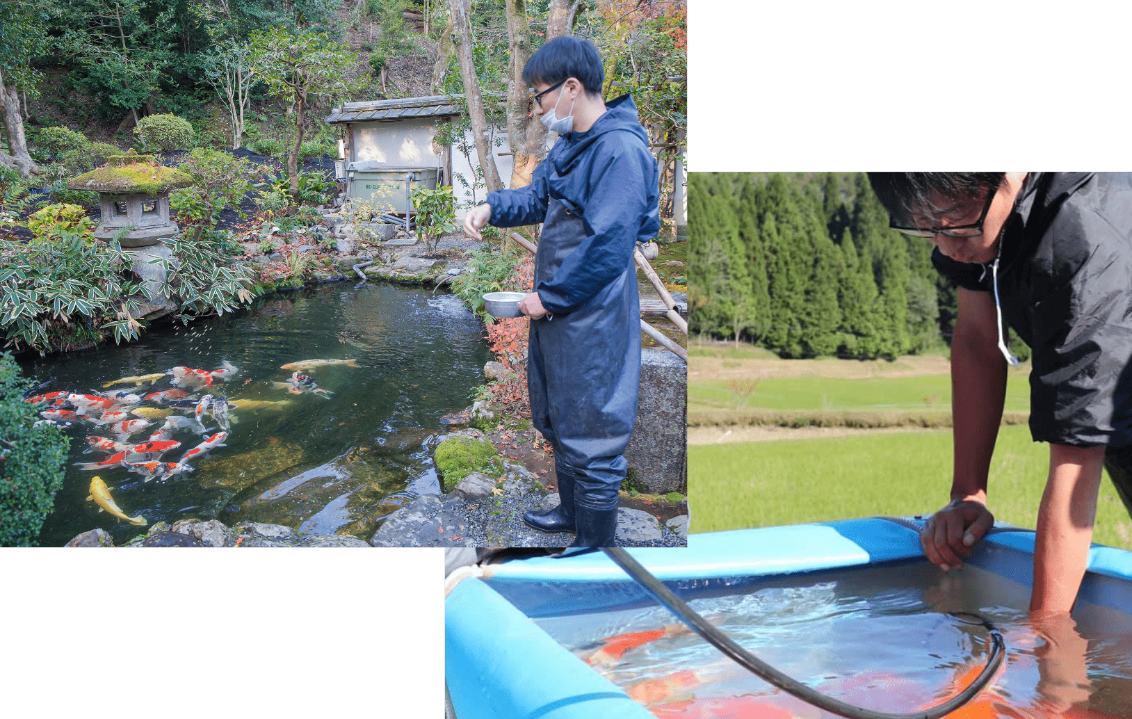 錦鯉の管理や世話だけでなくいかに池の存在を必要としてもらえるかを徹底的に勉強し、納品したお客様の池そのものの管理、保全も行っています。鯉のことを理解したうえで、庭と一体化した池をつくり上げてみせます。今では多くのお客様から池の管理まで任せていただく、鯉と池づくりの専門家です。